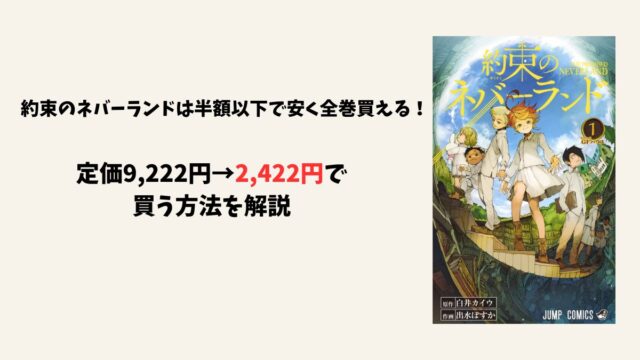 約束のネバーランドを安く買う方法を解説。電子書籍サイトのクーポンを組み合わせれば、定価9,222円の全巻セットを2,422円まで安くできます。Kindle・ebookjapan・ピッコマなどのお得なクーポン情報をまとめました。